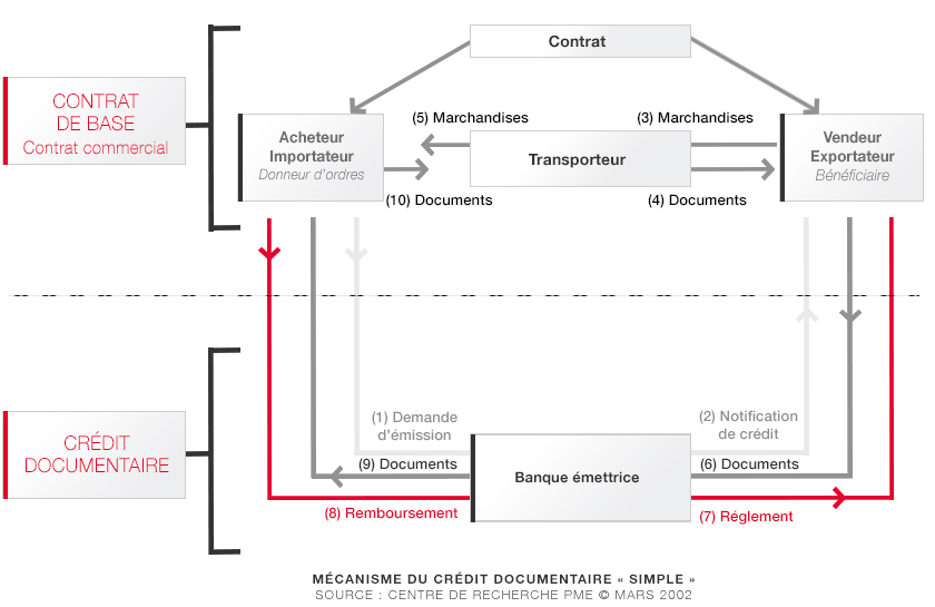 Le crédit documentaire est l’engagement d’une banque de payer un montant défini au fournisseur d’une marchandise ou d’un service, contre la remise, dans un délai déterminé, de documents énumérés qui prouvent que les marchandises ont été expédiées ou que les prestations ou services ont été effectués. L’objet de ces documents est de justifier l’exécution correcte des obligations de l’exportateur. Ces documents seront ensuite transmis par la banque à l’acheteur contre remboursement, pour que ce dernier puisse prendre possession de la marchandise.